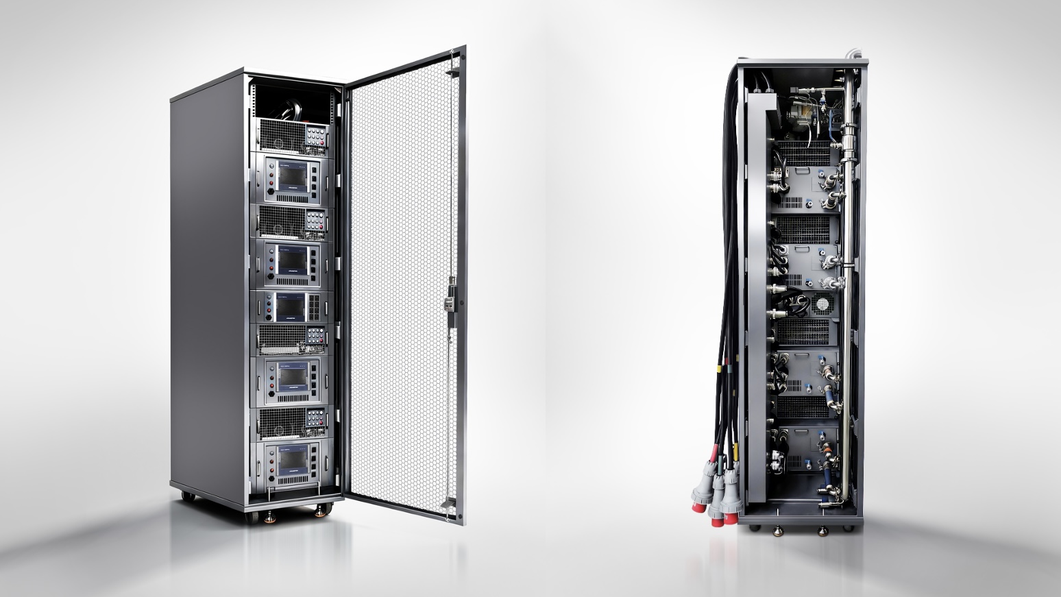 该假负载在单机柜中集成了四个液冷假负载模块和四个风冷假负载模块,整柜最大功率216kW(液冷168kW+风冷48kW)。测试人员可通过机柜中控屏和模块控制屏,灵活调节液冷与风冷的功率比例以及各模块的功率(步进精度≤1kW)。所有模块均支持拆卸,可被独立使用。