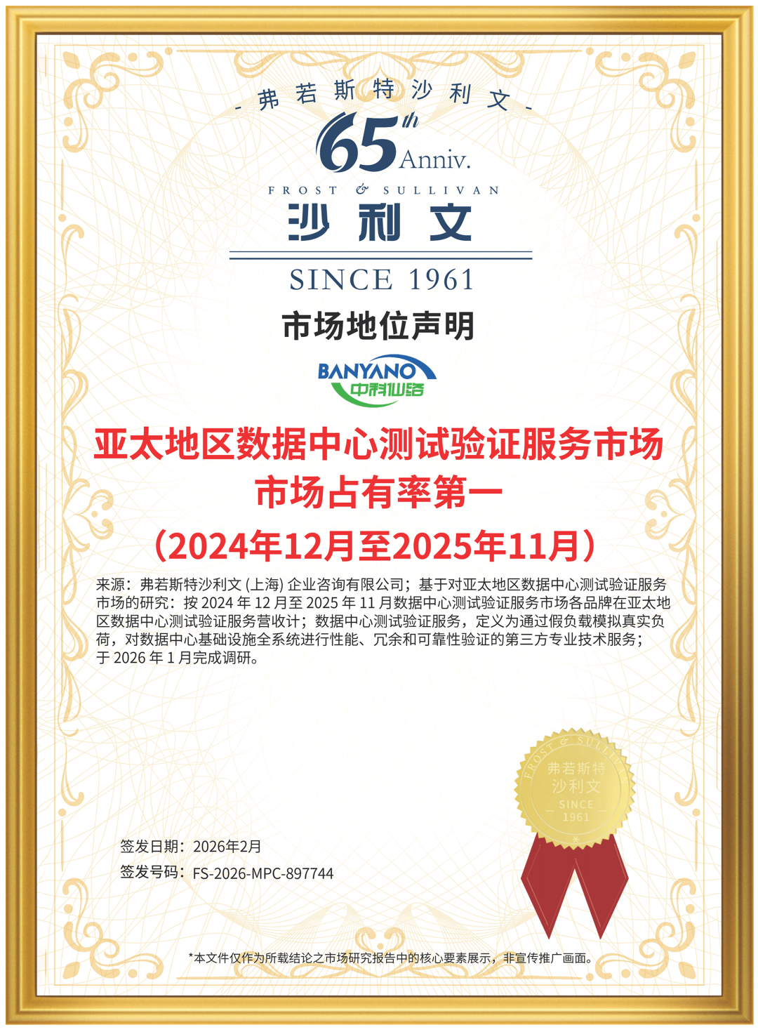 向中科仙络颁发市场地位声明: